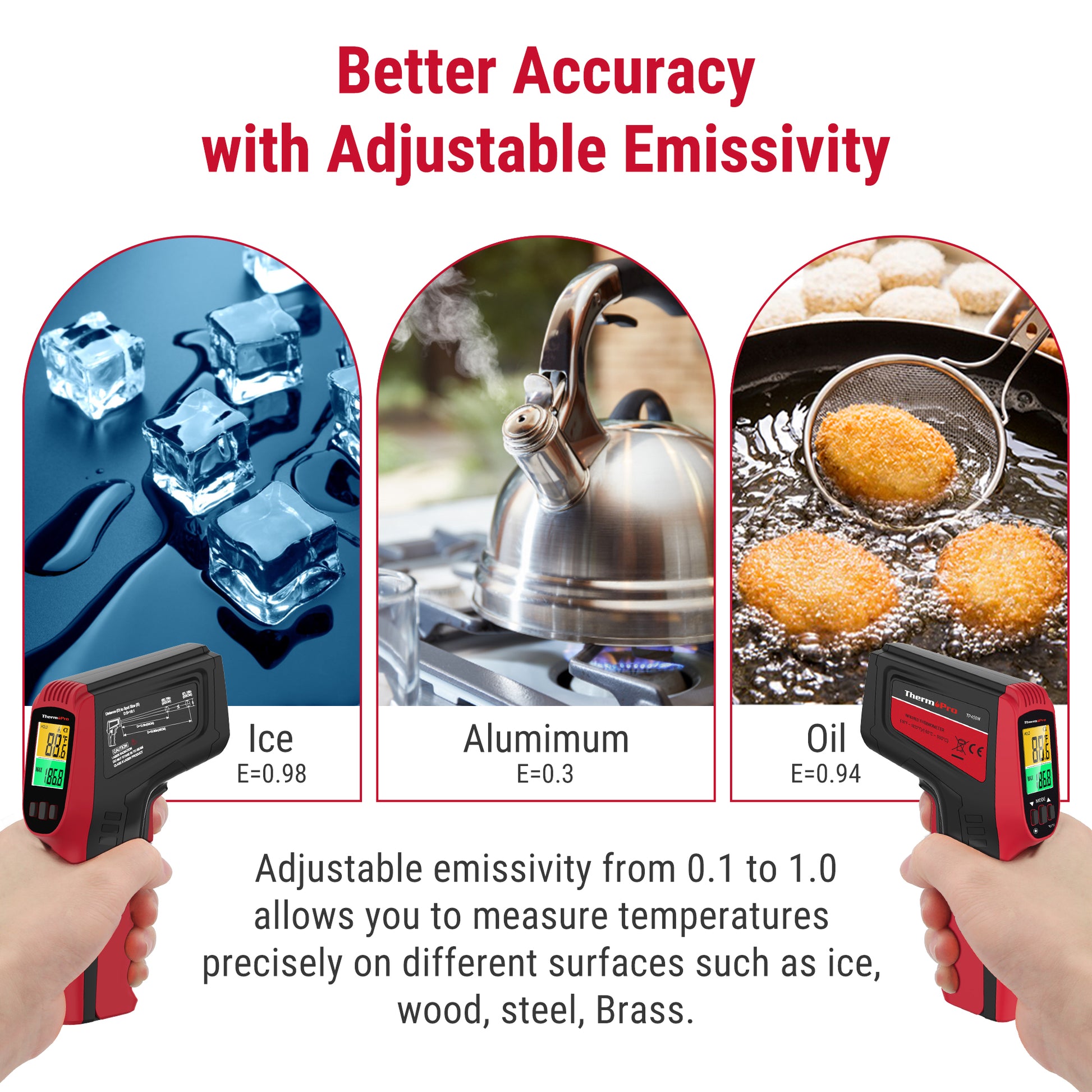 • Increased Safety and Accuracy with Longer Distance-to-Spot Ratio: Equipped with the latest thermopile technology and a distance-to-spot ratio of 16:1, the ThermoPro infrared thermometer gun enables you to read temperatures from a safer distance than ever before, without sacrificing accuracy. The adjustable emissivity from 0.1 to 1.0 ensures measurement accuracy across different surface types, with up to ±1.5% accuracy.